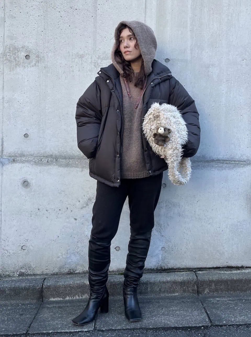 昨今ボリュームのあるパンツのトレンドが続いていますが、細身のパンツやレギンスをブーツインするスタイルもやっぱり素敵ですよね。特にトップにボリュームを持ってくる場合、ボトムをコンパクトにすることでコーデ全体がスッキリと見え、スタイルアップも叶います。ボトムとブーツをブラックのワントーンでまとめると引き締め&脚長効果も!