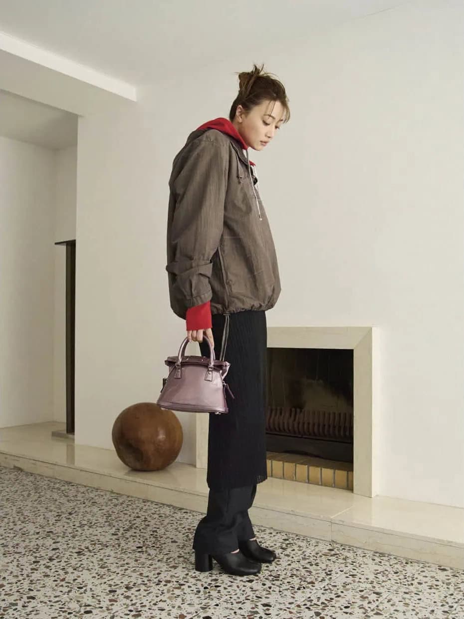 堂々の第1位に輝いたのは大人気ブランド、メゾン マルジェラの「タビ」パンプスと「5AC」のバッグを使ったスタイリング。インパクトのある真っ赤なフーディとブルゾンには、ブラックのスカート×パンツをレイヤリングして、カジュアルルタイルをモードに昇華。シューズはパンプスで女性らしさを、メタルピンクのバッグで個性をプラス。
