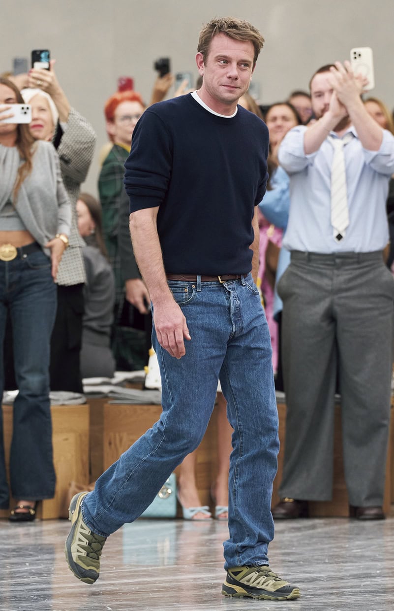 ジョナサンは就任後、マイキー・マディソン、ミア・ゴス、グレタ・リーを次々と新アンバサダーに指名し、「レディ デイオール」のキャンペーンに起用。デューコレクションのフロントロウには、彼の“ニュールック”を着こなすアンバサダーたちがずらり(右からグレタ・リー、ジェニファー・ローレンス、ジス、マイキー・マディソン)。