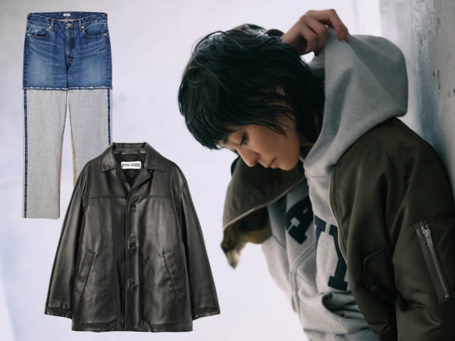 MA-1にロゴ入りのフーディ、デニムパンツと王道のアメカジコーデながら、こだわり抜かれたシルエットや素材使いで、こんなにも遊び心溢れる着こなしに。ショートブルゾン¥97,900、フーディ¥42,900、スエットデニムパンツ¥53,900(全てアンスクリア/アマン)、スニーカー¥22,000(アシックス/アシックスジャパン カスタマーサポート部)