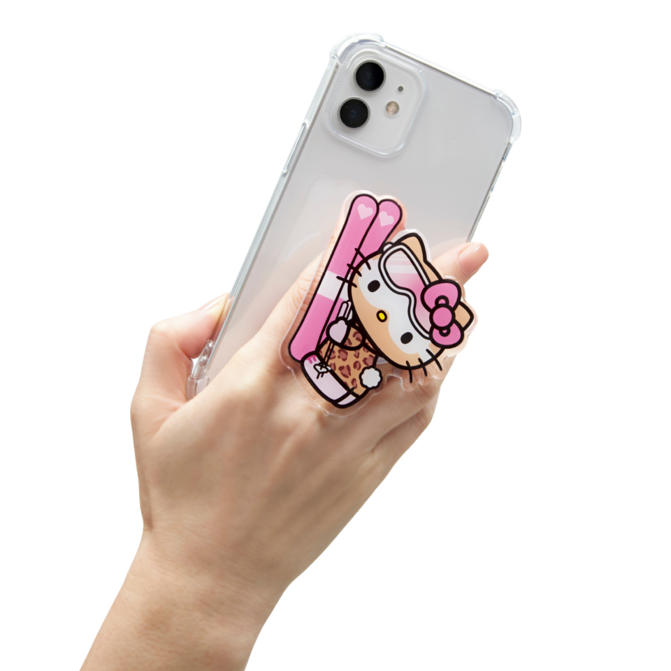 大きな雪焼けハローキティがインパクト抜群の折りたたみスマホグリップ。裏面の剥離シールをはがして、樹脂製など凹凸のないスマホケースに貼り付けて使用してください。開き方を変えれば便利なスマホスタンドにもなる!