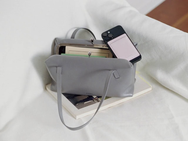 〈マグネティックカードホルダー〉[H9.5×W6.5×D0.5cm/札入れ0、小銭入れ0、カードスリット1、ポケット0] ¥55,000、バッグ[H14×W25×D9cm] ¥415,800(共にジル サンダー/ジルサンダージャパン)