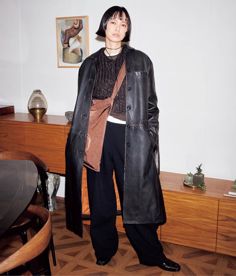 「ほぼこの1年で買ったアイテムでスタイリングしたのですが、依然として黒多め。もはや、黒を選ばないと落ち着かない体質なのかも。そして今シーズン新調したアウターは、ほぼロングコート。私だいぶ偏ってますね(笑)。アウターや小物でレザーの硬質さを入れると、カジュアルな格好でもピリッとして、適度にかっちりと引き締まるのが好きです」。