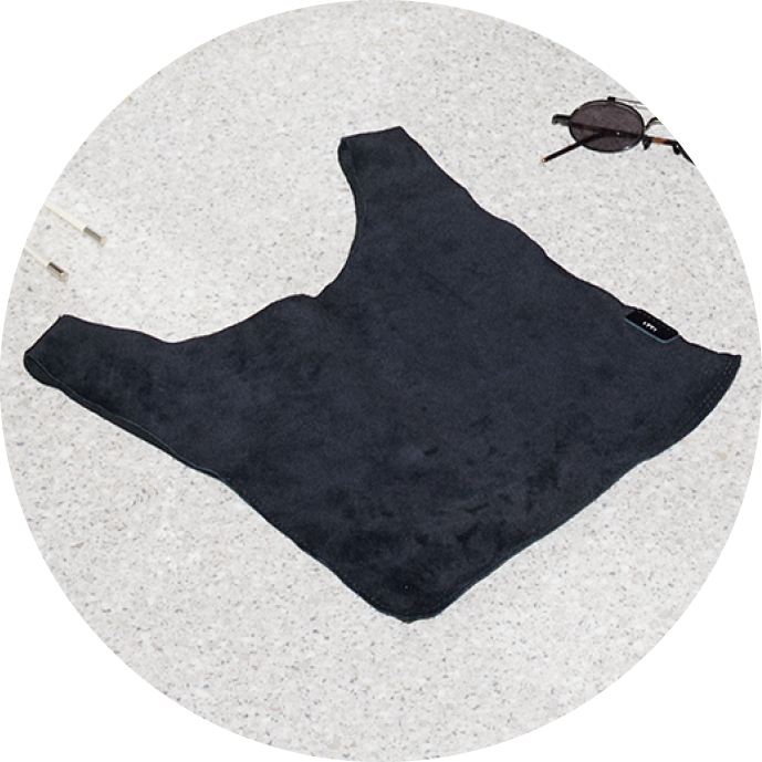 「リップと財布とケータイがあれば出かけられる私には、このくらいのミニサイズで十分」。イッチの黒スエードバッグ/本人私物