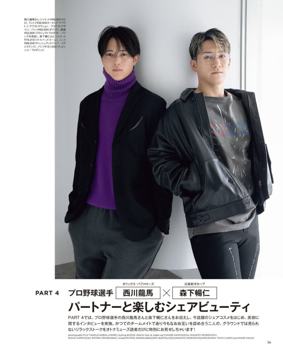 そして! 3月号発売前からSNSで話題になっているのがコチラ、オリックス西川龍馬選手と広島の森下暢仁投手が繰り広げる、まさかの美容トーク。2年前まで広島東洋カープの元チームメイトだったご両名が語る、最新のプロ野球選手のリアルな美容意識までわかる超、貴重な特集です。パートナーや家族でスキンケアをシェアするのはもはや令和の常識。メンズがフェイスパックするのも常識ですよ!