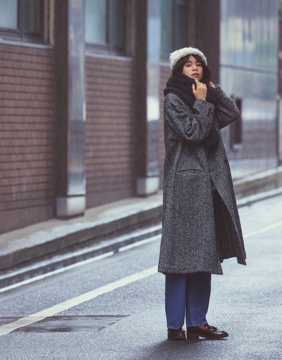 ボリュームたっぷりのストールとニットキャップなら寒い日の外出だって無敵の暖かさ。シックなカラーリングで全身をまとめながら、今季のキーカラーでもある真っ赤なソックスをさり気なくきかせてポイントに。ニットキャップ¥18,150(CA4LA/CA4LA プレスルーム)、ストール¥23,100(TODAYFUL / Life ’s 代官山店)、コート¥97,900(クチュール・ド・アダム/ホワイトオフィス)、デニムパンツ¥28,600(RHC/RHC ロンハーマン)、ソックス¥1,100(靴下屋/タビオ)、ローファー¥25,960(ツモリチサト ウォーク/モーダ・クレア)