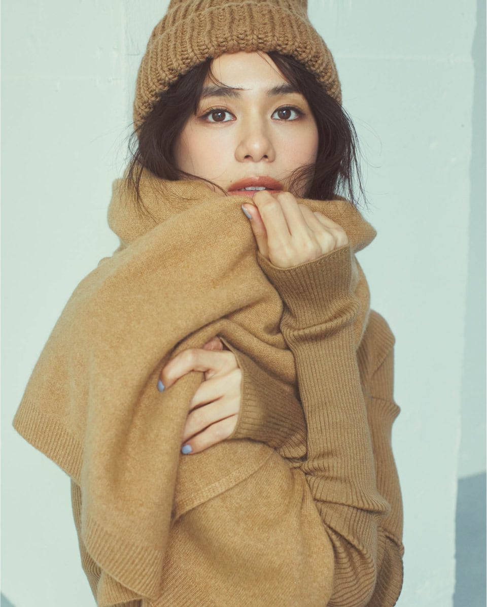 キャメルのワントーンでまとめて大人っぽい印象に。それぞれ異なる編地や質感を合わせるのがポイント。