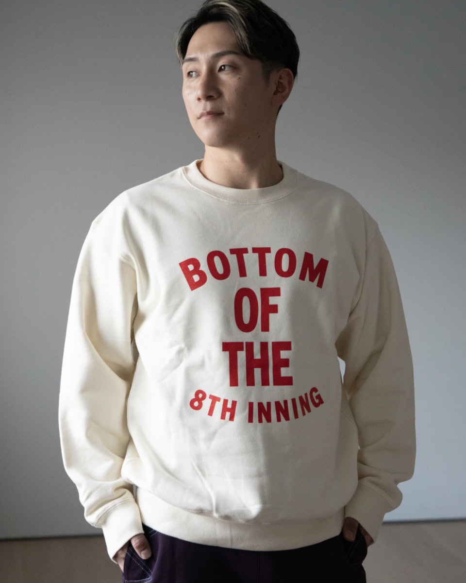 森下選手のように長身の人でも着られるサイズ展開(S~XXL)も嬉しい。8回の裏スエット¥15,400(Fmill Studio)