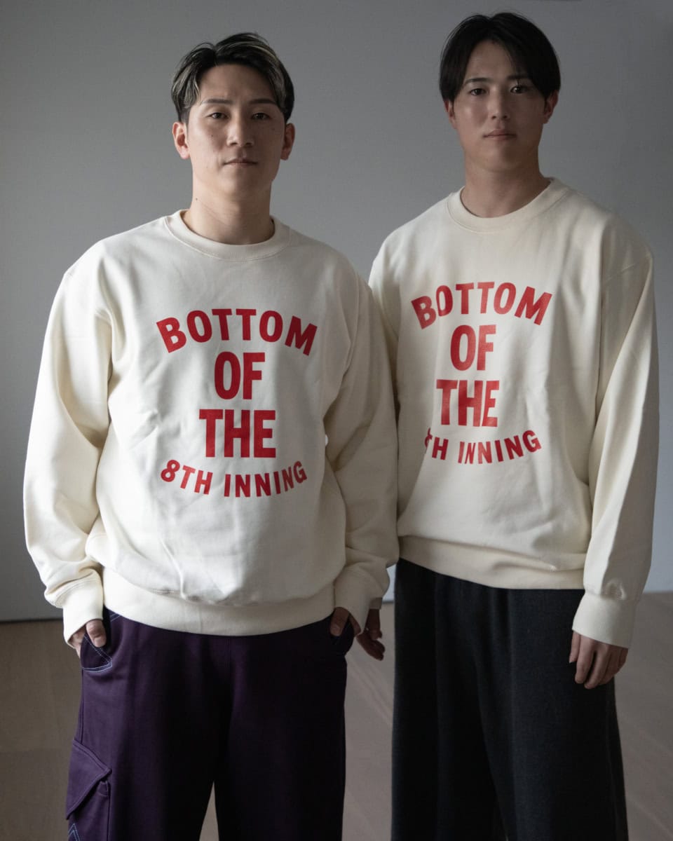 現在発売中のオトナミューズ3月号の初登場で早くも話題沸騰中の2人は、オリックス・バファローズの西川龍馬選手と広島東洋カープの森下暢仁投手。彼らのイケメンぶりも気になるところではありますが、今回は2人が着ているお揃いの「BOTTOM OF THE 8TH INNING (8回の裏)スエット」をご紹介します。