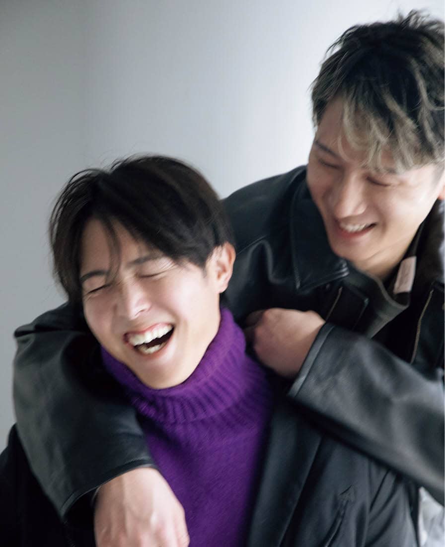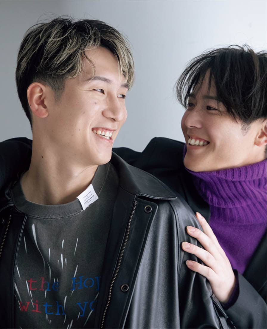 西川龍馬さん:ジャケット¥99,000(CCU)、Tシャツ¥38,500(トーキング アバウト ジ アブストラクション/ブリゲイトデザイン)、パンツ¥60,500(ダイリク)、森下暢仁さん:ジャケット¥79,310(リトルベッドルーム)、ニット¥68,200(キャッシュアンドバルバ/エグジステンス)、パンツ¥121,000(ラッピンノット/ウメダニット)