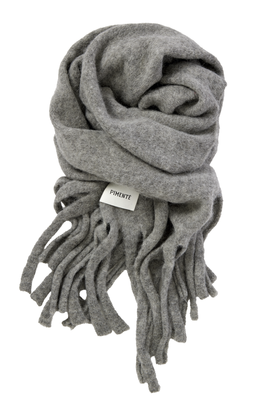 トレンドのフリンジデザインが印象的。汎用性の高いライトグレーも◎。ストール¥39,600(ピモンテ)