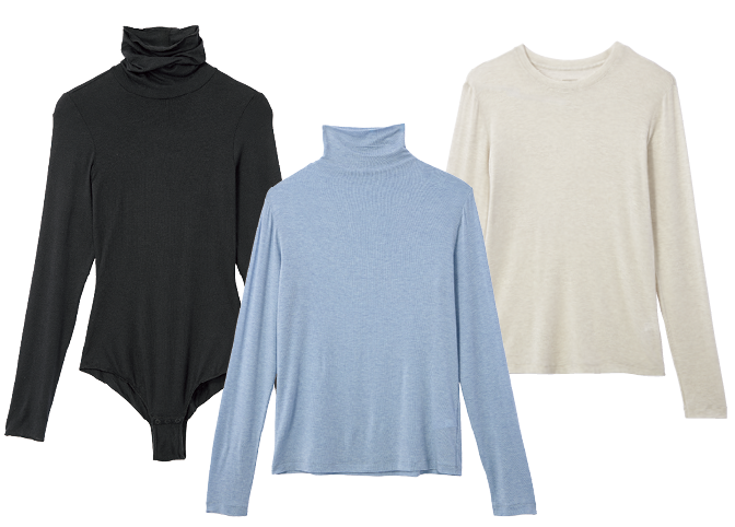 左から:細身のボトムにもOK。オールインワン¥8,990(インティミッシミ/インティミッシミ 渋谷文化村通り店)、極暖ヒートテックにカシミア入りが登場。タートルネックT、クルーネックT 各¥2,290(共にユニクロ)