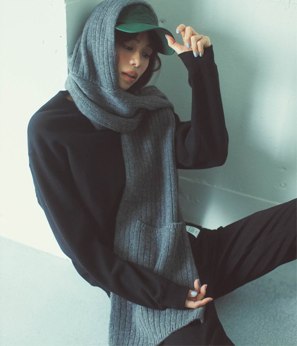 三角ニットスカーフ同様、フード付きのニットマフラーも今季よく見られるアイテムのひとつ。頭と首が同時に温められるのでひとつ持っていると重宝すること間違いなし! フードをかぶらないときはサラッと巻くだけでも。