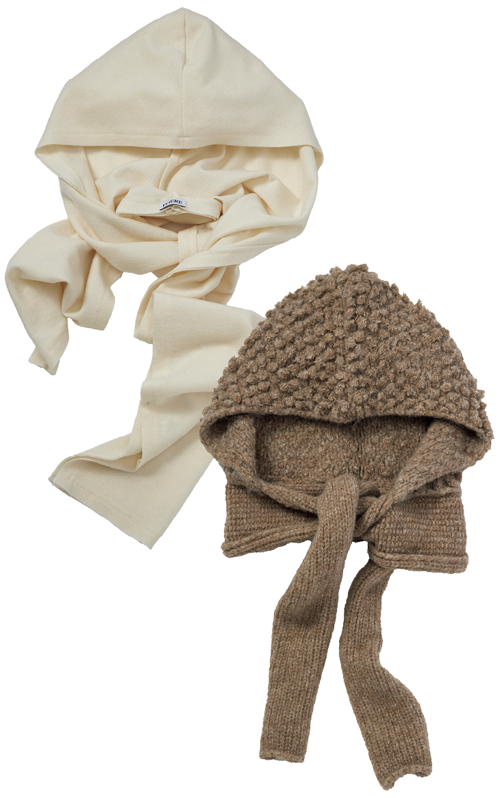 フード付きマフラー左から:ハイゲージ&シンプルなデザインは大人っぽい雰囲気。¥17,000(PHERE)、ポコポコとした編地が表情たっぷり♡ ¥15,400(オリエント ミリナリー)