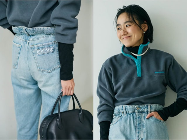 デニムインやパールネックレス合わせで【フリース】を着こなす|金子綾の「オール私服」コーデ