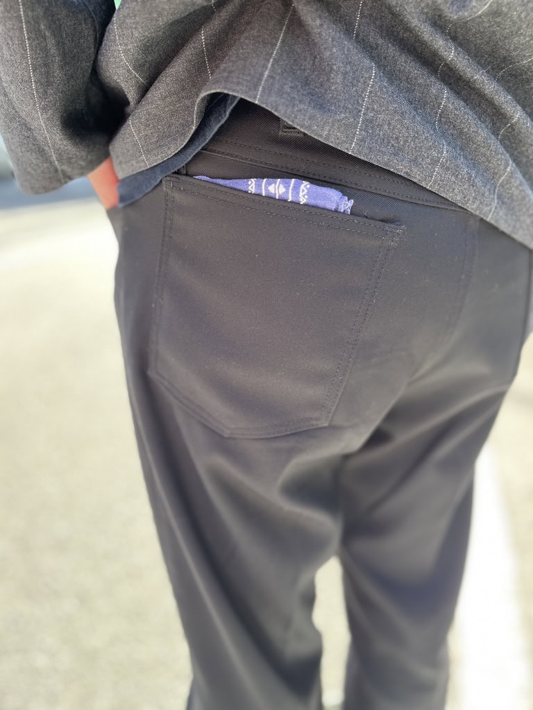 ふとしたときにチラッと覗いたヒップポケットのバンダナ。こういった見えない部分へのこだわりもメンズならではですよね