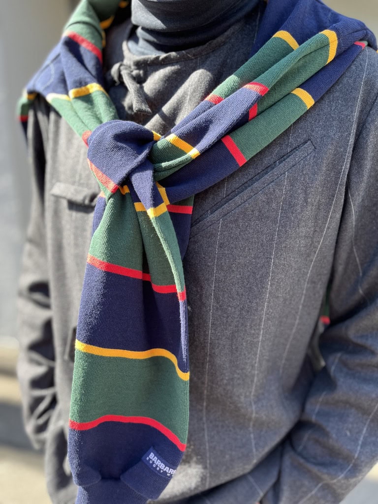 そんな関口さんの梅春スタイルでひと際目を引くのは、肩かけしたラガーシャツ。「今回の着こなしにおけるトゥーマッチなアイテムが、このラガーシャツです。シックなモノトーンでまとめつつ、多色使いのボーダーを差す。こういったちょっとした違和感が、スタイリングに遊びももたらしてくれるんです」。さらに注目すべきはボトムス。「じつはここ5年ほどはブーツカットしかはいていないんです。昔から好きで最近気分ということもありますが、これも自分にとってちょっとした違和感なのかもしれません」