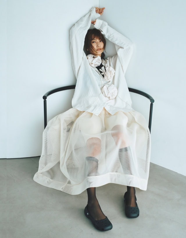 シャツ¥15,950、ブラトップ¥4,990(共にAKTE)、スカート¥19,800(メゾンスペシャル/メゾンスペシャル 青山店)、ピアス¥18,700(ココシュニック オンキッチュ/ココシュニック)、コサージュ¥30,800(HAAVE)、ソックスはスタイリスト私物