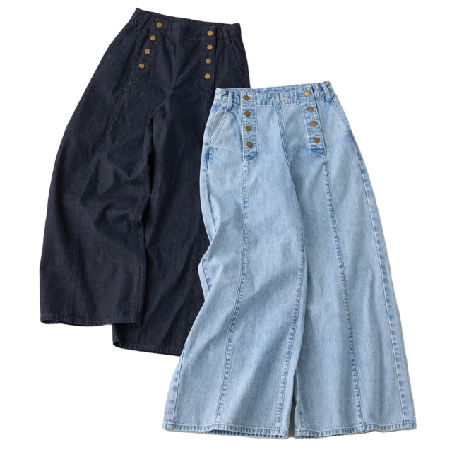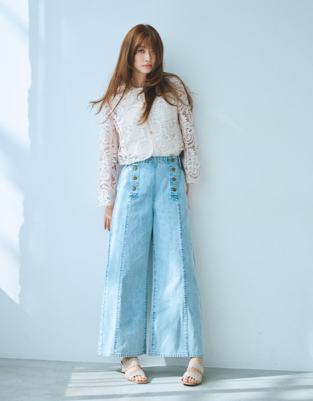 LANVIN en Bleuオリジナルデザインのマリンパンツを、今季らしくデニム素材で表現したコラボレーションモデル。ウエストまわりはベルトレスでスッキリと、ヒップからまっすぐに落ちるワイドシルエットでメリハリをきかせたラインになっています。気になるヒップまわりをさりげなくカバーし、私たち世代のボディラインをスマートに見せてくれると評判。ヨンアのようにレースのジャケットを合わせて華やかにも、通勤時にはシンプルなニットやテーラードジャケット合わせも素敵です。柔らかなデニム素材を使用しており、ノーストレスではけるのも嬉しい! フロントに並ぶタックボタンにはLeeの刻印入り。アンティークゴールドがさり気ないポイントになっています。