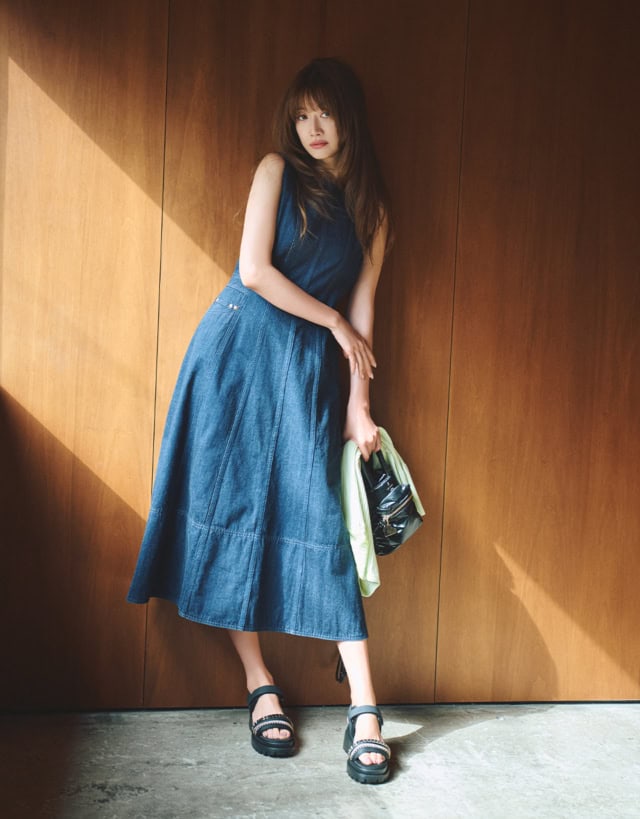 こちらもブランドオリジナルのドレスデザインをベースにした1着。エレガントでありながらも、Leeならではのステッチワークやリベット、ピスラベルといったディテールを取り入れ程よいラフさを効かせた唯一無二のドレスに仕上がりました。1枚でサラッと着るだけでサマになるドレスは、春夏の大人の必需品。たっぷりとフレアを描きながらも、腰から上はタイトめなシルエットなので、ジャケットなども羽織りやすく、着まわし力も。ヨンアのようにサンダルを合わせれば軽やかに、バレエシューズやローファーなどシューズの選択次第で、異なった雰囲気を楽しむことができます。
