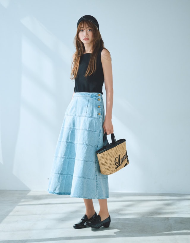 ティアードのようにボーダー状に入ったステッチが女らしさをぐっと際立たせてくれるデニムスカート。腰まわりのシルエットはデニムパンツと同様に、スッキリとしつつヒップから下にキレイに広がるAラインが最大のポイント。サイドのタックボタンがアクセントになり、細見え効果も。パンツやドレス同様、柔らかなデニム素材を使用しているため、見た目以上に軽やかでストレスフリーなはき心地を実現しながら、オフィスカジュアルにも対応できるような上品さも宿しています。オフにはヨンアのように潔くニット1枚で、オフィスシーンではツインニットやブラウス合わせが鉄板。最近スカート離れしていた! という方でもこのロング丈ならトライしやすいはず。通年着用できるので、ワードローブに取り入れておきたい1着です。