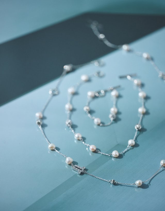 淡水パールにパヴェボールとマーガレットのつぼみをイメージしたメタルボールをリズミカルに配置したコレクション。同デザインのピアス・イヤリングも展開。シルバーカラーベースなので、甘さ控えめで涼しげ。華やかさはありつつも華美になり過ぎないので、オフィスシーンから子どもの学校行事まで幅広いシーンで使いやすいデザインになっています。