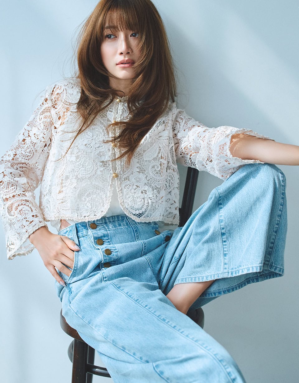 LANVIN en Bleuオリジナルデザインのマリンパンツを、今季らしくデニム素材で表現したコラボレーションモデル。ウエストまわりはベルトレスでスッキリと、ヒップからまっすぐに落ちるワイドシルエットでメリハリをきかせたラインになっています。気になるヒップまわりをさりげなくカバーし、私たち世代のボディラインをスマートに見せてくれると評判。ヨンアのようにレースのジャケットを合わせて華やかにも、通勤時にはシンプルなニットやテーラードジャケット合わせも素敵です。柔らかなデニム素材を使用しており、ノーストレスではけるのも嬉しい! フロントに並ぶタックボタンにはLeeの刻印入り。アンティークゴールドがさり気ないポイントになっています。