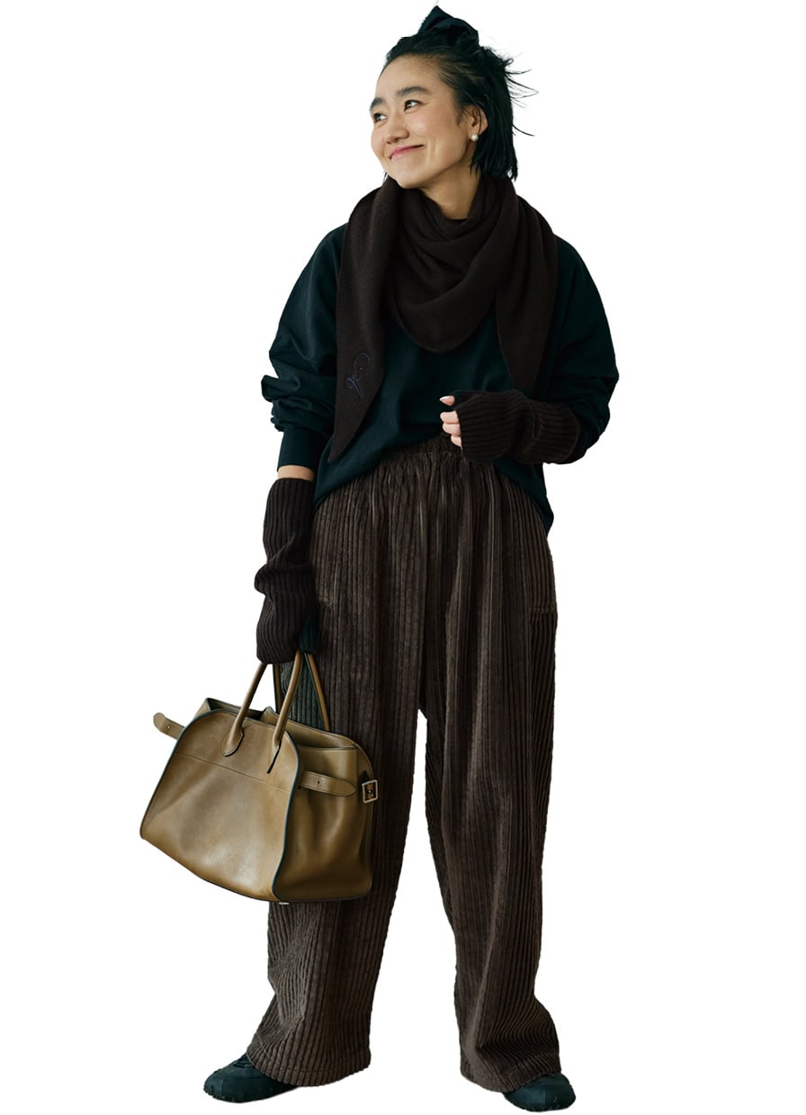 ASAUCE MELERの三角ニットストールとニットグローブ、COUDREのロンTとシュシュとピアス、Gabriela Coll Garmentsのパンツ、THE ROWのバッグ、LEMAIREのスニーカー/全て本人私物