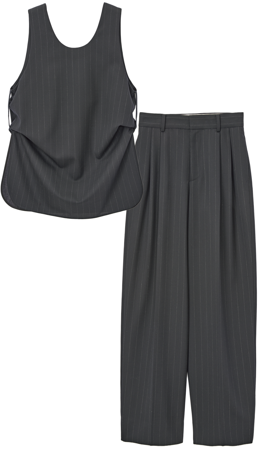 「トップスはサイドボタンでドレープやシルエットを変えられるデザイン。まずはセットアップでキレイめに着て、カジュアルにまとめたいときはレギンスなど合わせてもおしゃれ」