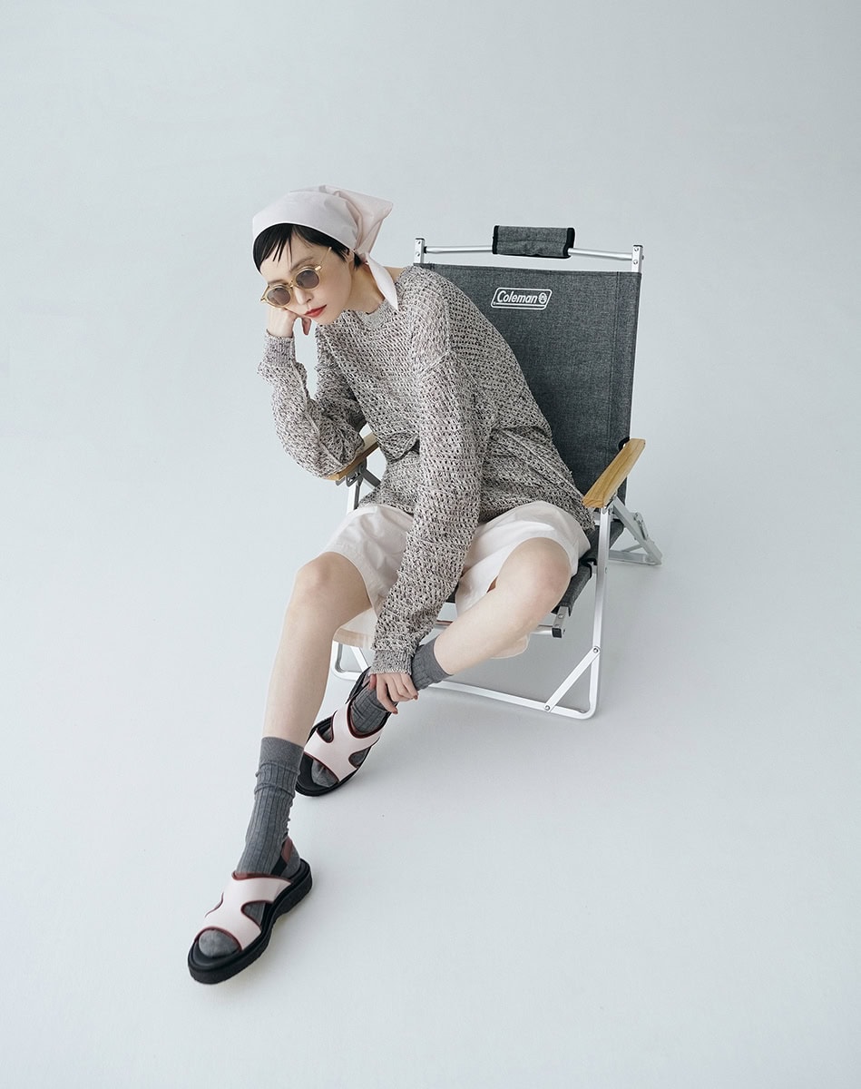 チェア〈コンパクトフォールディングチェアNX〉¥9,900(コールマン/コールマン カスタマーサービス)、ニット¥39,600(ヨーク/エンケル)、パンツ¥28,600、スカーフ¥15,400(共にLittle $uzie Apartment Tokyo)、サングラス¥55,000(カーニー/ソスト)、ソックス¥3,630(パンセレラ/真下商事)、靴¥88,000(アデュー/バウ インク)、インナーはスタイリスト私物