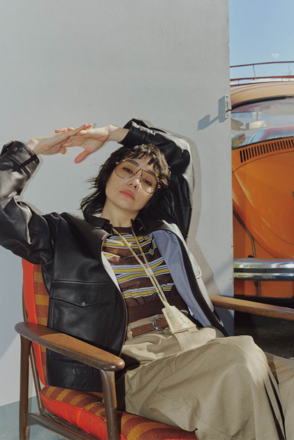 スタイリッシュな佇まいが魅力的な1着。レザージャケット¥352,000(バウト)、ニット¥36,300(オブリオ)、パンツ¥31,900(ハイク/ボウルズ)、メガネ¥69,410(ミュウミュウ/ルックスオティカジャパン カスタマーサービス)、ベルト¥57,200(デアンシェ/S&T)、キーホルダー¥25,300(ラ プレスティック ウィストン/サロン アダム エ ロペ)
