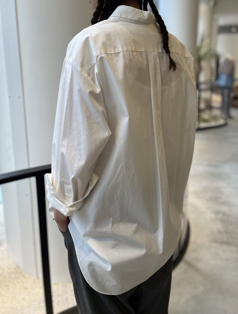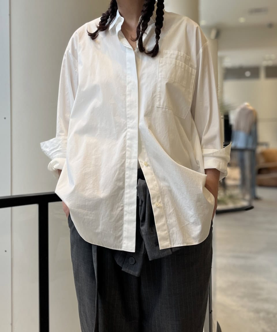 シャツは基本的にボタン全閉めで着たいタイプなんですが、これは第1ボタンを開けてもイイ感じ。ボタン全開けで、ワンピースなどの上に羽織ってもよさそう!