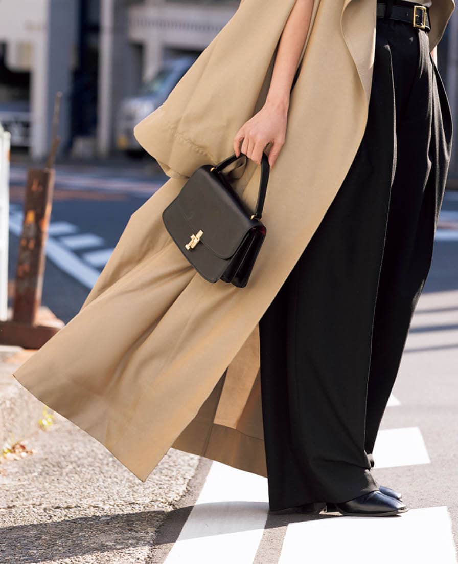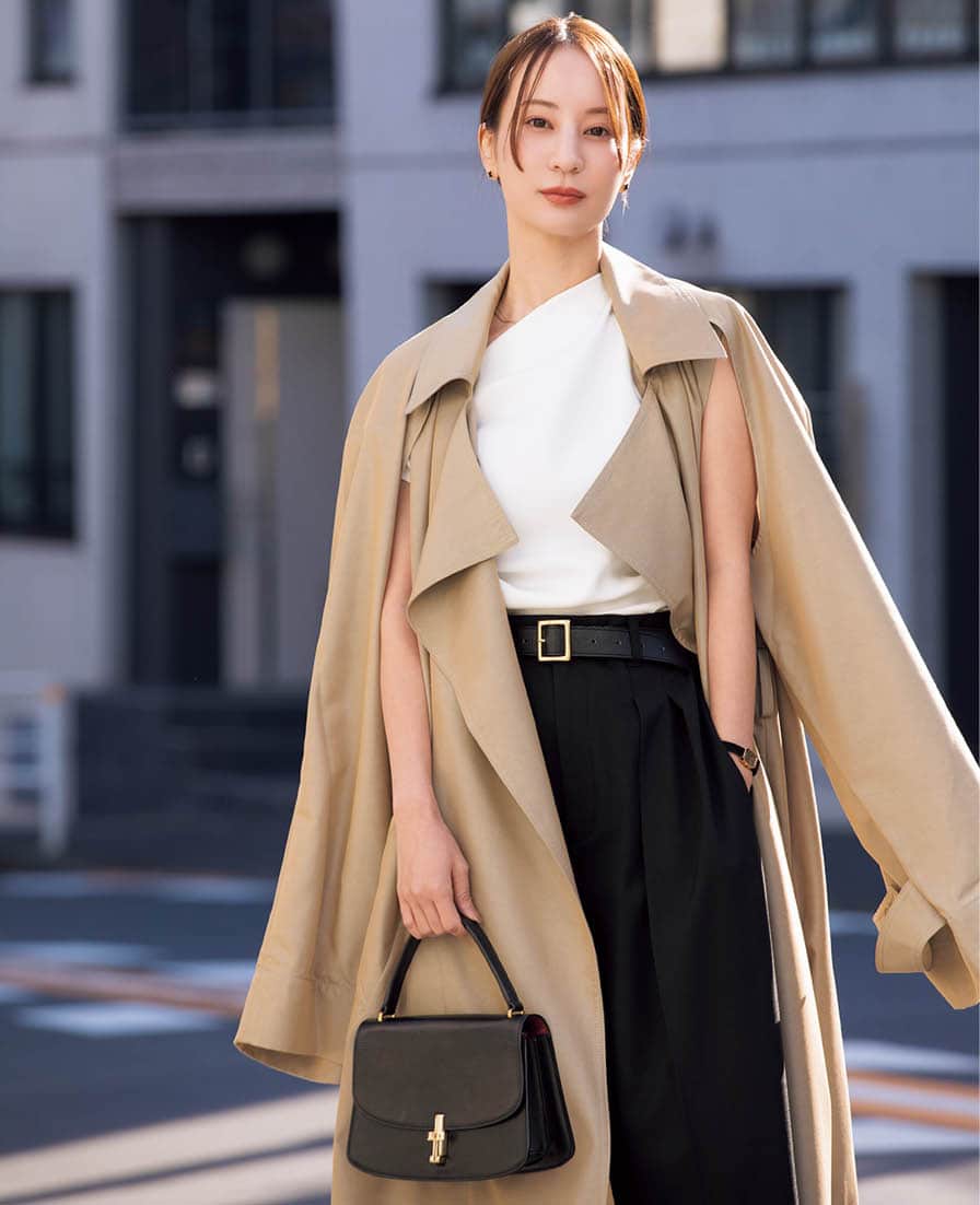 トップス¥18,900、パンツ¥19,800(共にヴェニカ/Souple)、フランキー ショップのトレンチコート、ヴェニカのベルト、ザ・ロウのバッグは全て本人私物