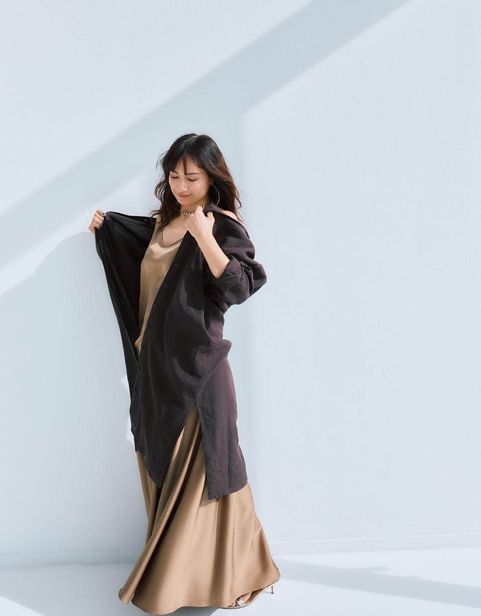 シャツドレス¥52,800、キャミソール¥29,700、スカート¥52,800(全てドゥーズィエム クラス)、シューズ¥121,000(アクアズーラ/全てドゥーズィエム クラス ルミネ横浜店)、ネックレス、ピアスはスタイリスト私物