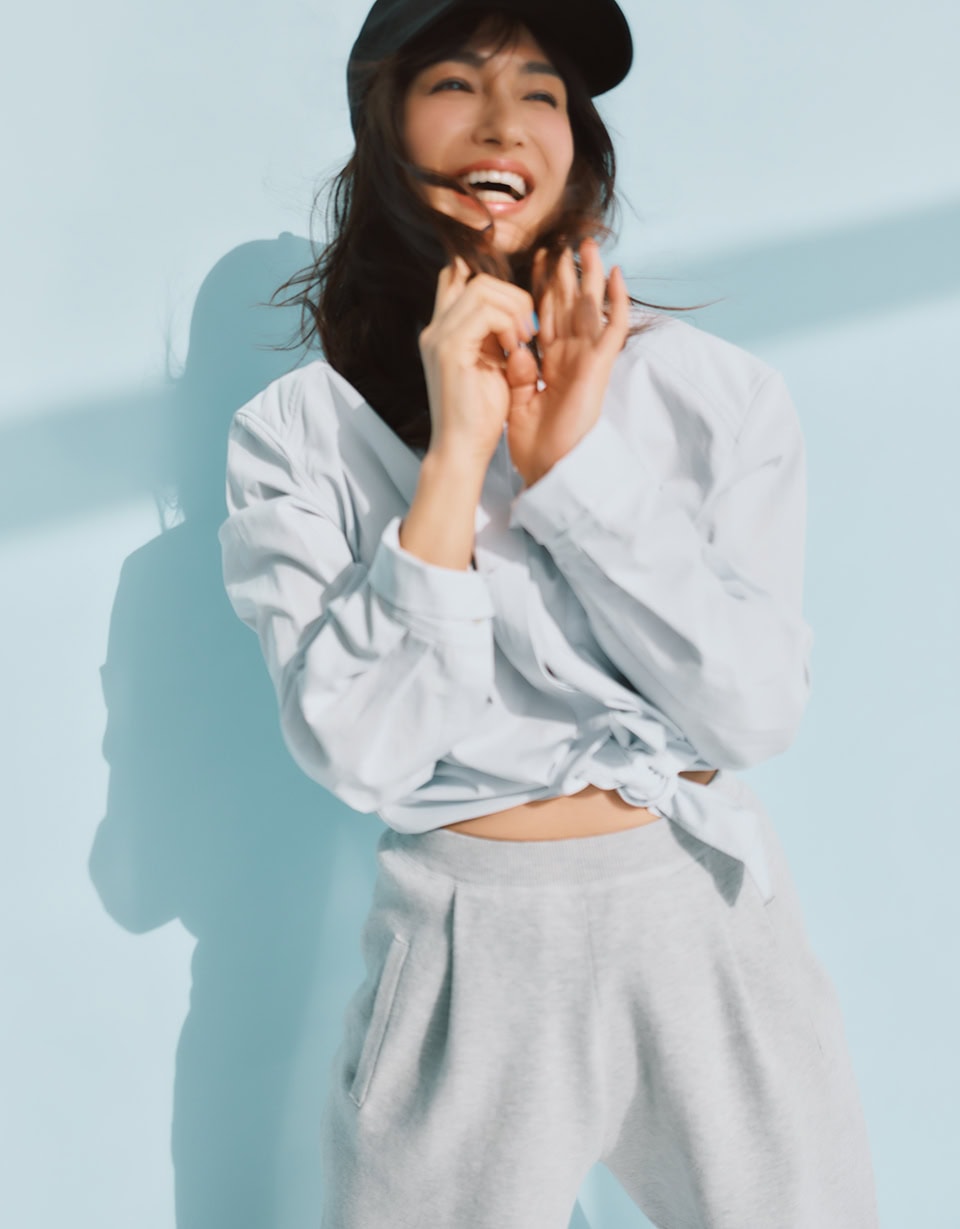 澄んだサックスブルーが爽やかさを誘うシャツも今季のトレンドキーワード。シャープな顔立ちが持ち味だけど、あえて裾をラフに結んでクロップト丈にアレンジすることで遊び心とヌケ感をメイク。スエットのハーフパンツやキャップでやんちゃにまとめても、自然と大人っぽいムードをキープできるその実力の高さは期待以上! いろいろな着方を楽しんでみて。