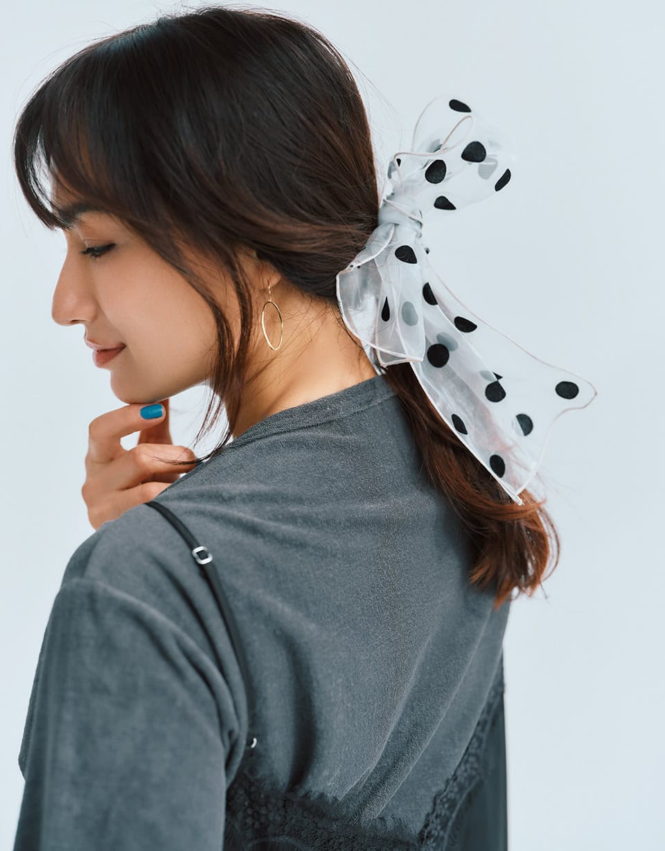 スタイル3のルックで披露したヘアはコチラ。装いに物足りなさを感じたときこそヘアアクセの出番。シアーなドット柄のリボンシュシュは、軽やかな透け感と程よくハリのあるチュール素材で、リボンにしても甘くなり過ぎず大人にお似合い。両結びならリボンのフォルムを小さくカジュアルに、片結びならボリューム感を引き出して華やかにと、その日の気分やスタイリングに合わせてアレンジしながら楽めます。