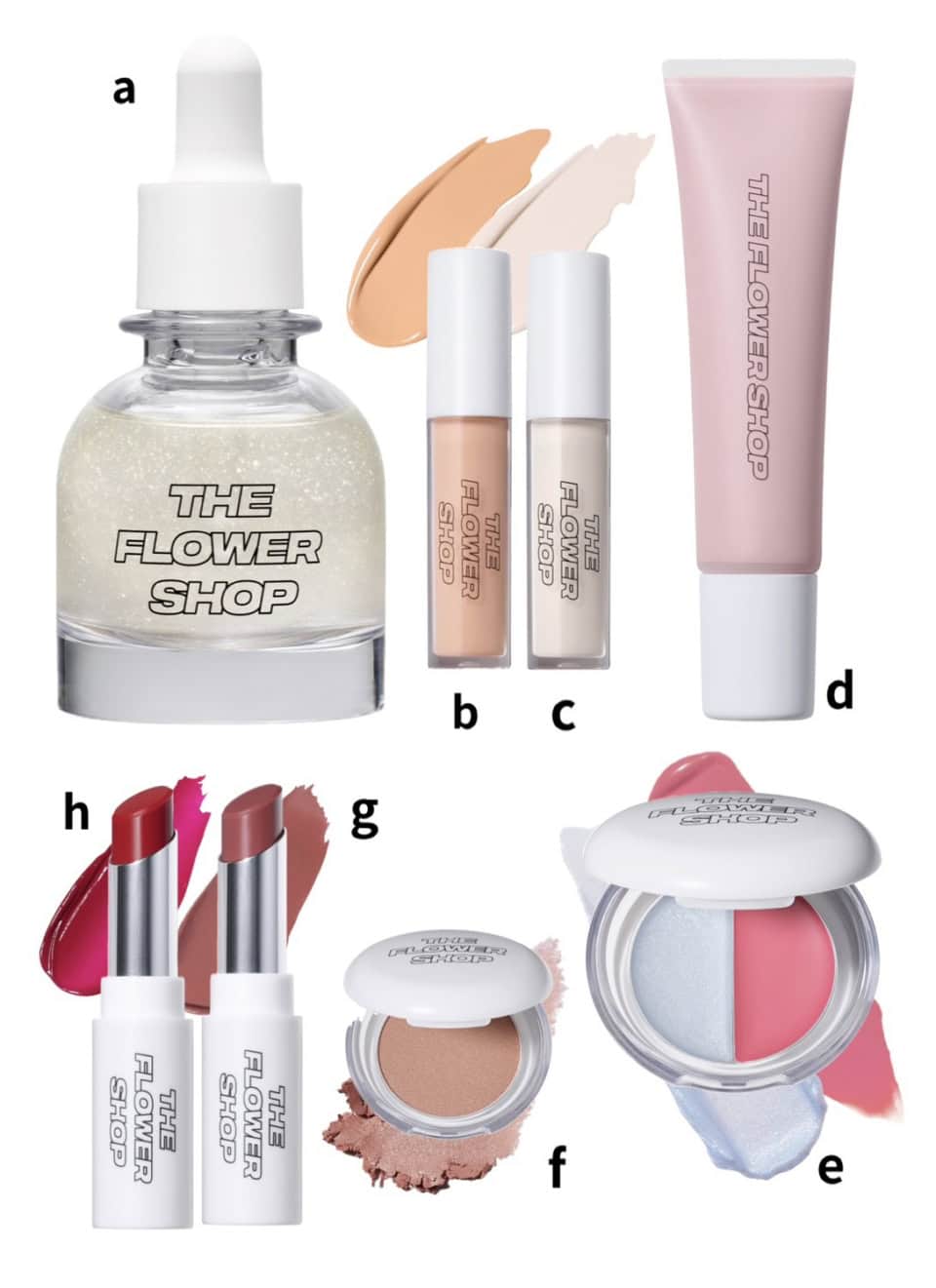 a シルキー ドロップ オイル¥3,080、b コンシーラー オレンジ SPF40・PA++++、c 同 ホワイト SPF40・PA++++ 各¥2,750、d ベース ピンク¥3,080、e マルチバーム サイネリア ¥2,420、f グロウチーク シダローズ ¥2,420、g ペタルルージュ ブラウンローズ、h 同 ピュアスイートピー 各¥2,420(全てザ・フラワーショップ/msh)