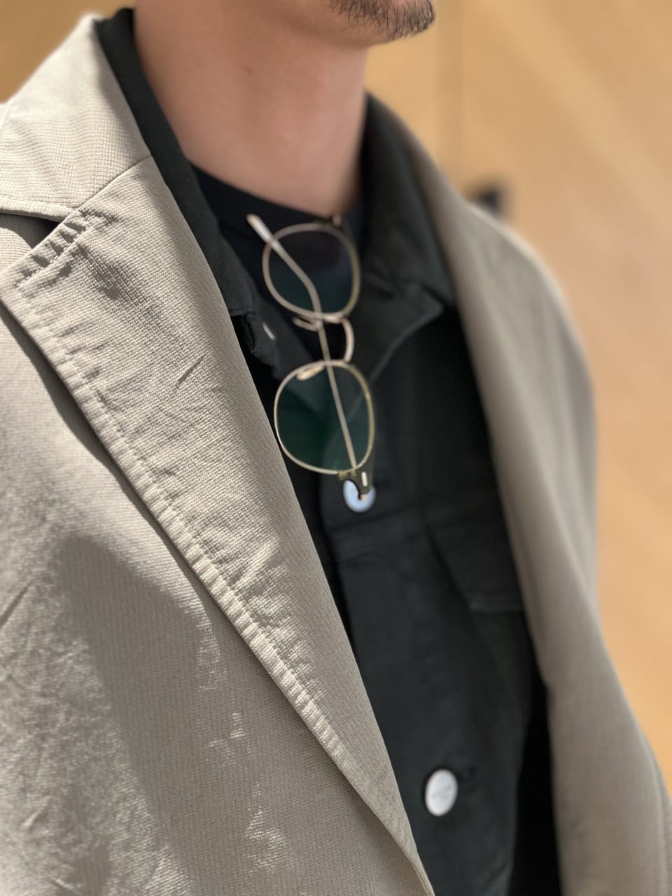 ベージュのジャケットと黒のセットアップのバイカラーが目をひく井平さんの着こなし。「Gジャンとデニムは、じつは炭黒なんです。グレーのようにも見えるのでセットアップで着ても重くなりすぎず、さらにはナイロン100%のベージュジャケットと合わせることで、春らしく軽やかな印象に仕上げました」