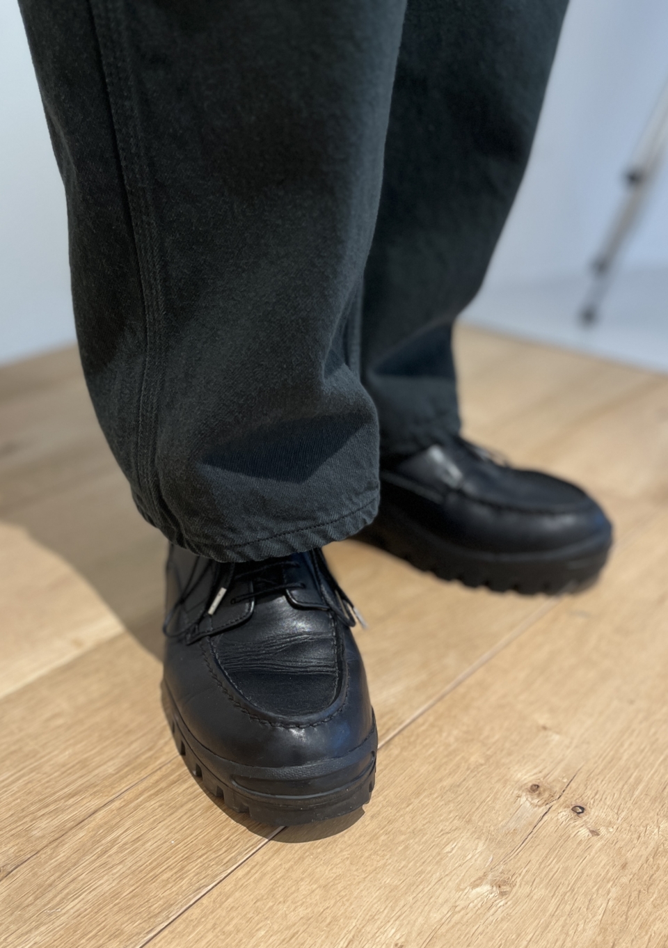 たっぷりとしたデニムに合わせて、足元もビブラムソールで程よいボリュームを
