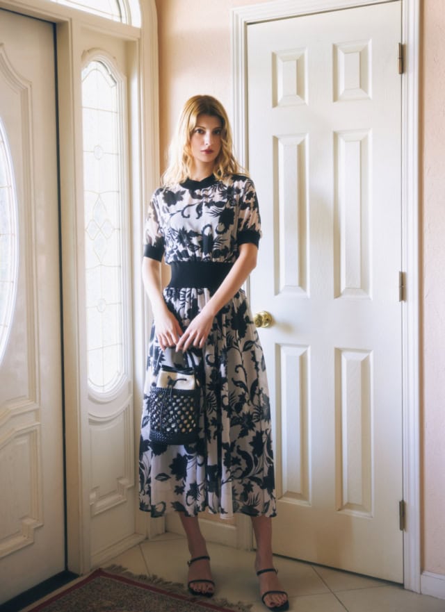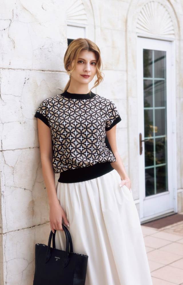 オリジナル柄のトップスバリエをもう一品。こちらは、エフォートレスなショルダーラインが着やすいニットタイプ。ナチュラルなブラウジングに仕上げてくれるウエストをはじめ、首元と袖口にも施された黒トリミングがリラクシーなシルエットにメリハリを与え、スカートとのタッグも洗練された雰囲気。