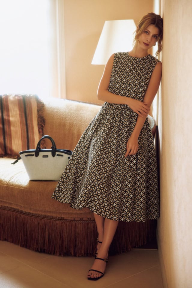 オリジナル柄のノースリドレスは、今季主流のロマンティックムードを投影させた、着るだけでサマになる美シルエットが決め手。トップ部分はサイド寄りに施した切り替えで心地よいフィット感。ウエストから下は、タック×ギャザーによるふんわりした揺れ感が、さり気ない所作をドラマティックに彩る。