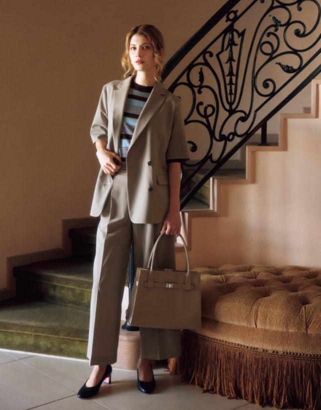 ダブルブレストのかっちり感とは裏腹に、柔らかなテンセル素材でラフに羽織れるジャケット。タック入りのストレートパンツとセットアップで揃えておけば、何かと出番が多そうです。肩の力が抜けたリラクシーなテーラリングスタイルは、ランウェイでも注目を集めた、この春のトレンド筆頭株。
