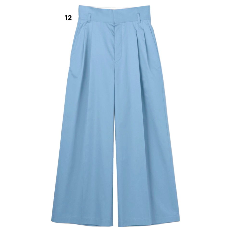 I 色でいえば、サックスブルーもいっぱい出てますよね。アンクレイヴのタック入りのワイドパンツ⓬、クリーンに白シャツとかと合わせたい。
