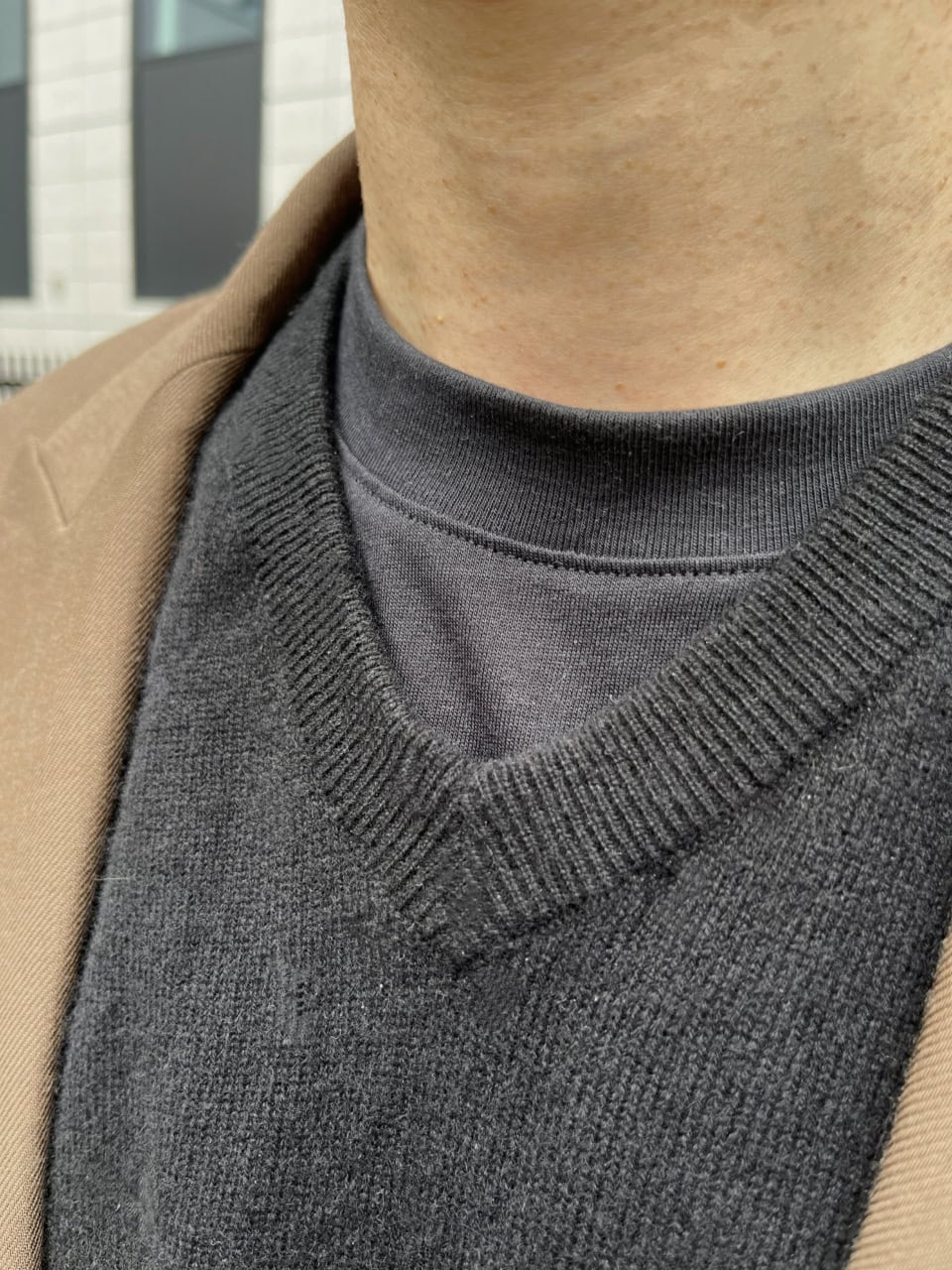 浅Vの黒ニットと黒Tの同色レイヤードが新鮮。白Tより洒落て見えますよね