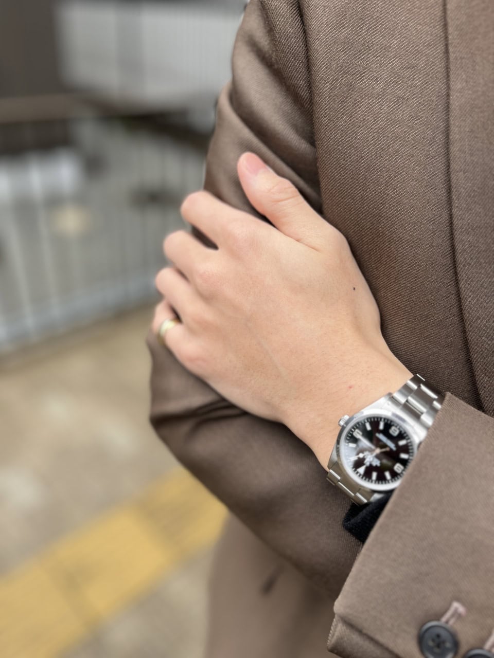 アクセサリーは時計とピンキーリングのみ。着こなし同様、シンプルにまとめていました