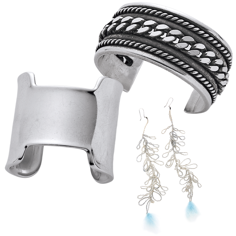 「私の毎日になくてはならないシルバージュエリー。どんなスタイリングにも不思議とマッチし、その重ねづけのバランスも楽しんでいます」上から:サンローラン、エルメスのバングル、モズデ マーティンのピアスは本人私物