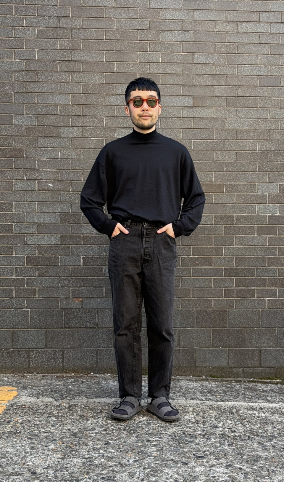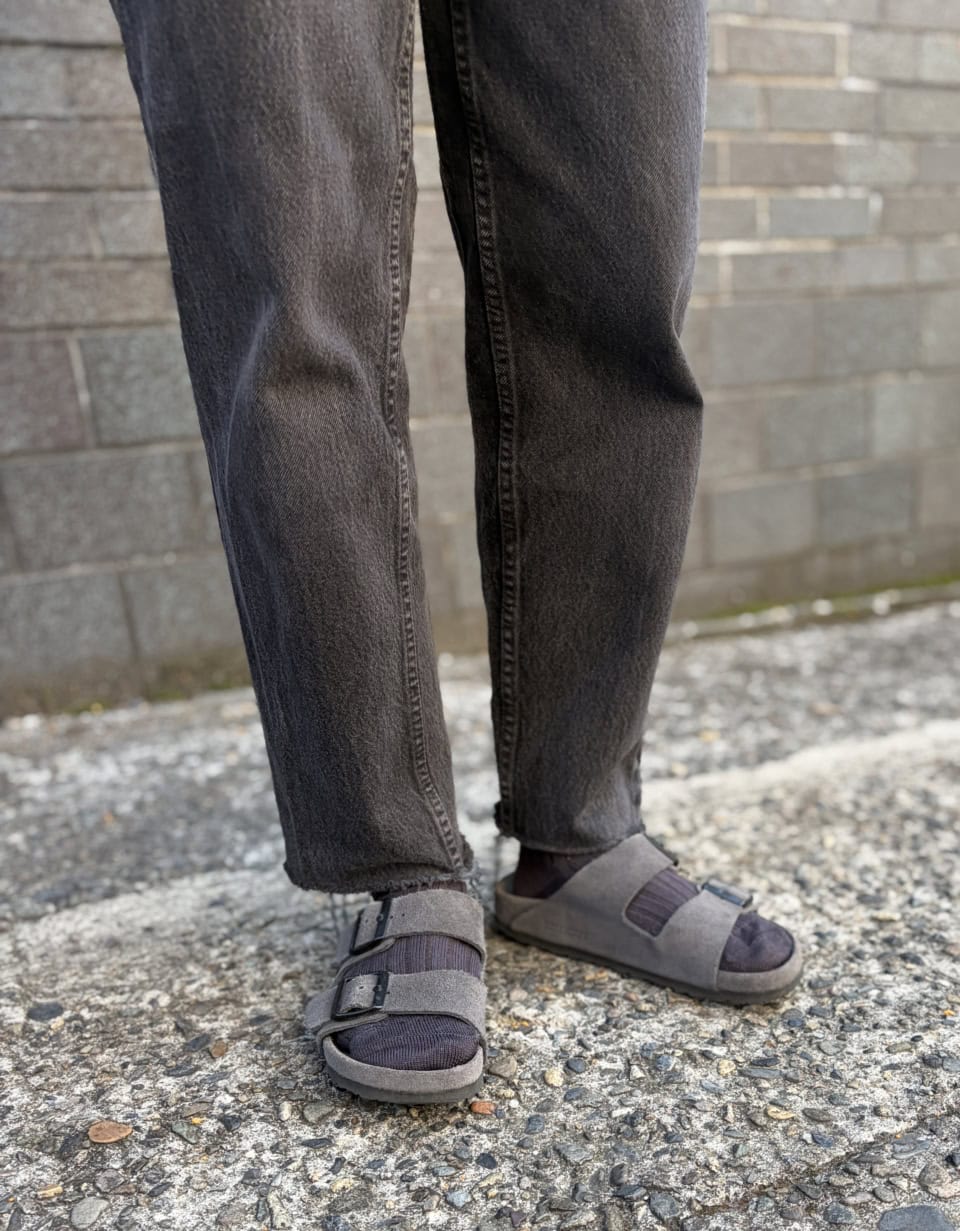 「ポイント2でもお話しした通り、サンダルに合わせるソックスは使用感が重要。スニーカーやローファーのソックスはつま先やかかとに擦れや毛玉ができやすいので、思いきってサンダル用ソックスを作るのも手。その際にチェックしていただきたいのが、無印良品やユニクロ、ファミリーマート。お手ごろな価格で使えるソックスを展開しているので、定期的に買い換えたいサンダル用ソックスにもうってつけなんです。ビルケンシュトックのアリゾナに合わせたのは、無印良品のソックス。どちらもグレーをチョイスしつつ、ソックスはやや濃いめに仕上げました。女性はサンダルとソックスにコントラストをつけた足元も多く見かけますが、同系色の合わせはおさまりもいいので、女性にもオススメですよ」(安武さん)