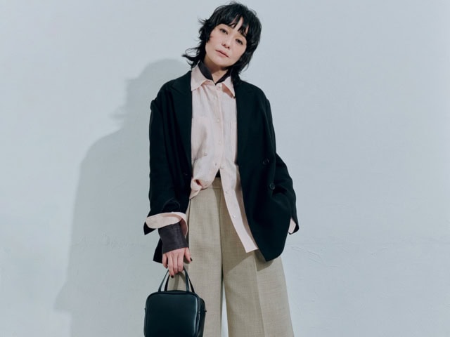 ジャケット¥49,500、シャツ¥26,400、中に着たグレーシャツ¥26,400、パンツ¥28,600(全てウィム ガゼット)、ローファー¥30,800※参考商品(ザ ポーズ/全てウィム ガゼット ルミネ新宿店)、バッグは増刊号付録、ソックスはスタイリスト私物