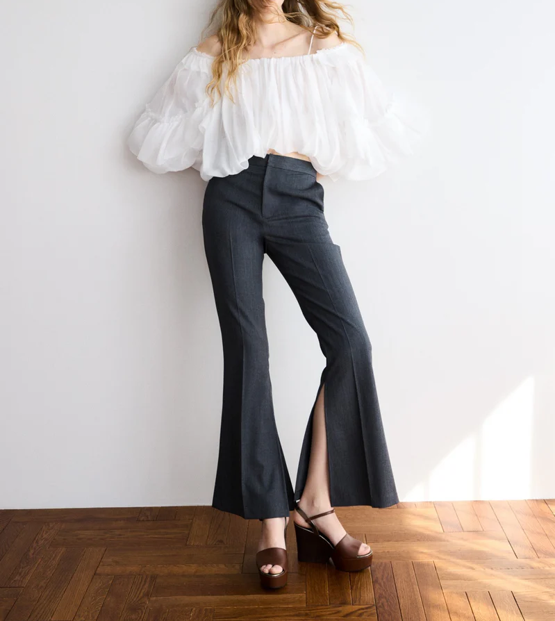 こちらはエアリーなバルーンフォルムが特徴のオフショルトップス。ハリのある生地を使用しているので、ふんわりと丸いシルエットをキレイに保ったまま着用でき、ボディラインを拾わない点も嬉しいですよね。素材も軽く風通しがいいので、真夏まで活躍してくれます。ブラックも大人なムードで素敵ですが、顔色をぐっと明るく見せてくれるホワイトがオトナミューズ的推しカラーです。写真のようにスラックスを合わせて、キレイ目にまとめればお食事会などにもぴったり、デイリーにはデニム合わせが鉄板です。