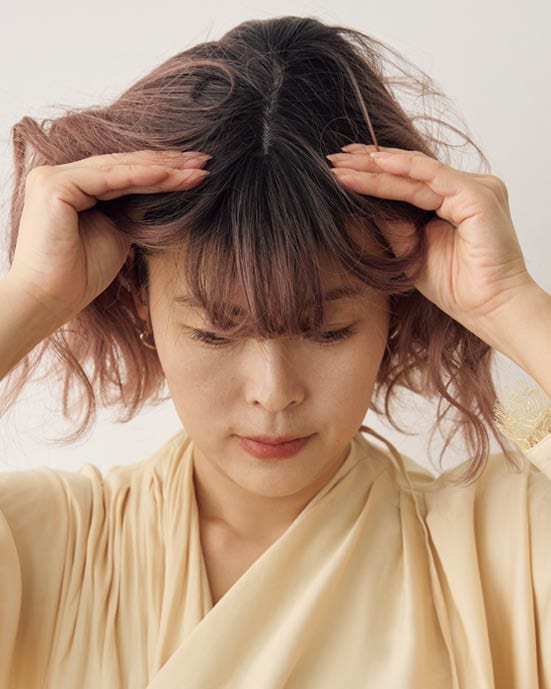 かぶったら、前髪の生え際から耳上、襟足まで親指をスライドさせながらピタッと固定します。鏡を見ながら頭頂部と前髪の位置を整えて完成。